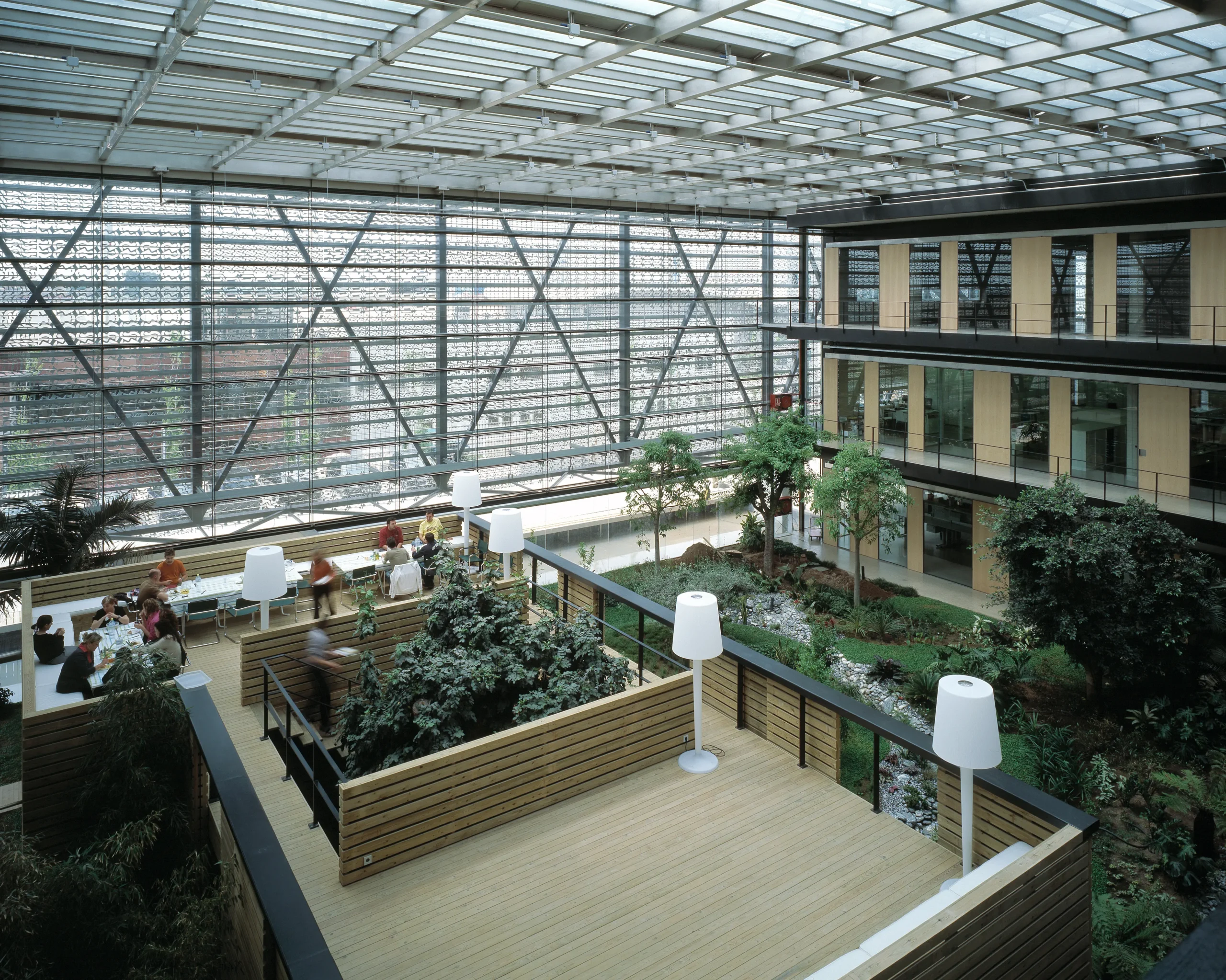 En la plaza interior se diseña una plantación tropical con diseño apoyado en el estilo de jardín japonés, que conecta los espacios ajaredinados de la parcela con un río. La utilización de materiales propios de este estilo, agua, bolos de piedra, troncos, gravas y arenas rastrilladas apoyan el diseño